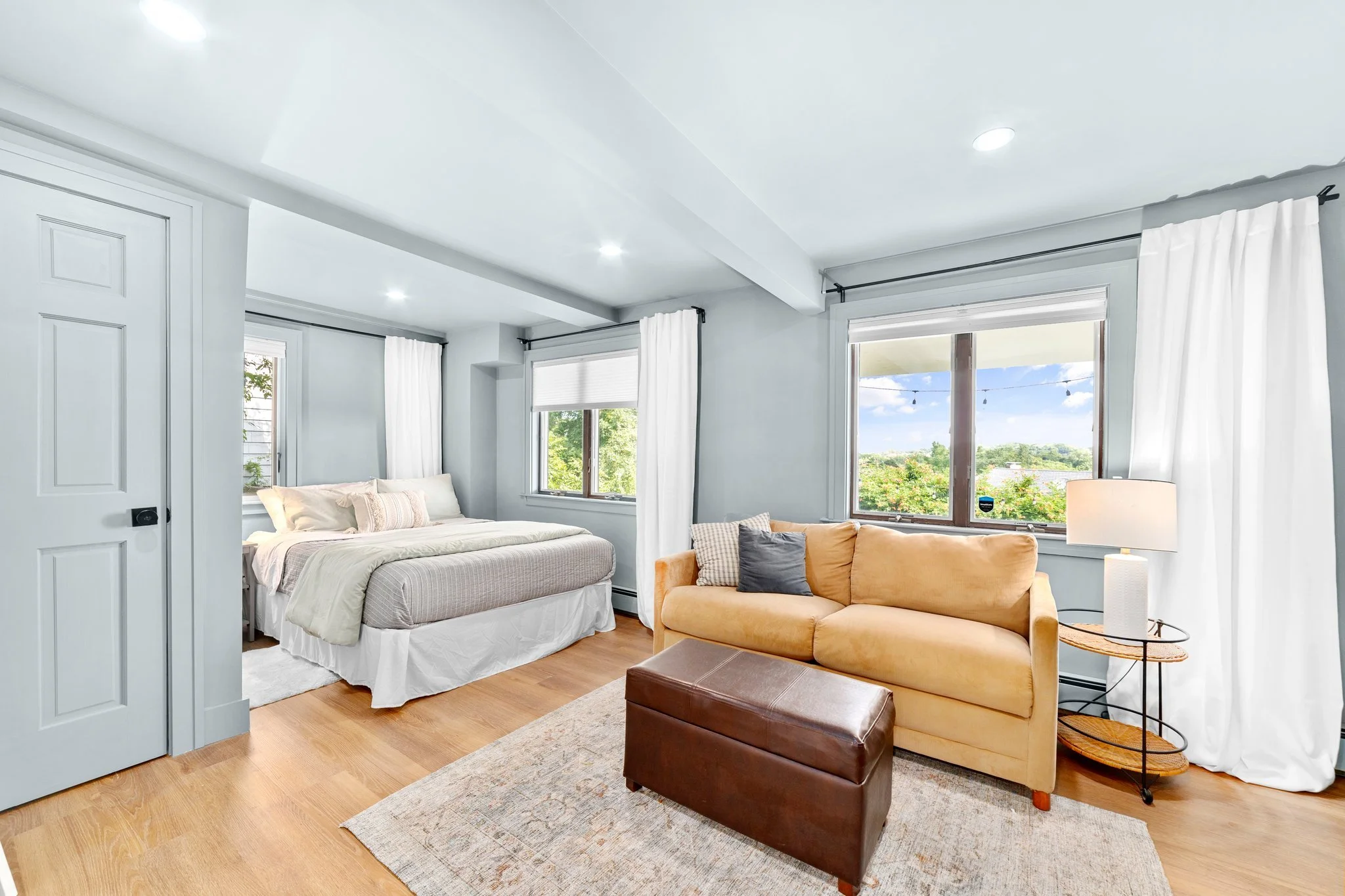 This is a studio suite in heart of Boston, perfect for couples to lay their heads while they explore the city. The property overlooks a large and lush backyard full of unique statues and flowers. We took inspiration from the garden view and incorporated the blues and greens to make this a comfortable and cozy space.